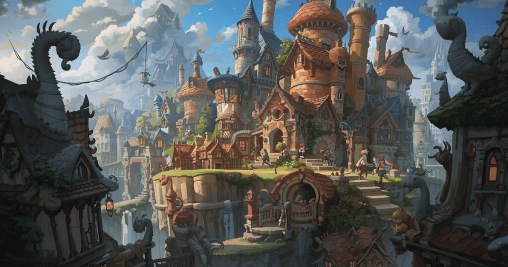 えんとつ町の緻密な書き込みを継承しつつ、本作では広大で神秘的な「砦」の風景が広がります。